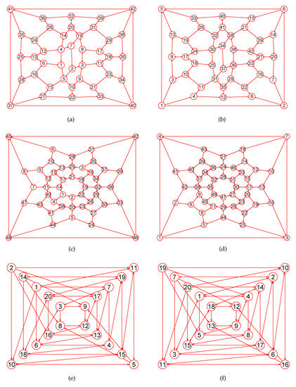 The MaxEm digraphs of three digraphs , , and . (a) A pentagonal icositetrahedral digraph with 38 nodes and 60 directed edges; (b) The MaxEm digraph of ; (c) The Faulkner-Younger digraph with 42 vertices and 62 directed edges; (d) The MaxEm digraph of ; (e) The Faulkner-Younger digraph with 44 nodes and 65 directed edges; (f) The MaxEm digraph of .