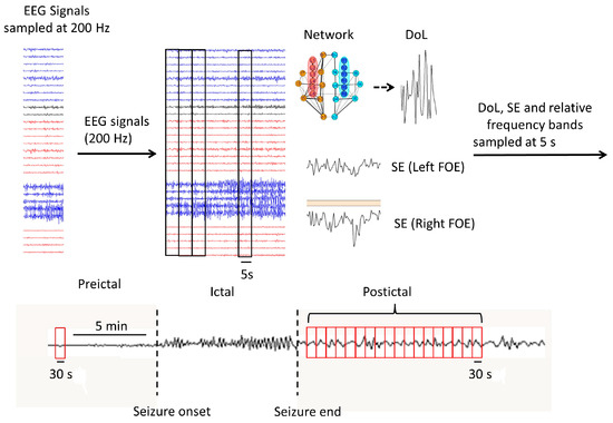 Schematic representation of the implemented procedure. Upper panel: at the left, EEG recordings from scalp (16 channels) and FOE (12 channels), sampled at 200 Hz (only a subset of channels, in a bipolar montage, is displayed). In every temporal window (black rectangles) of 1000 data points (five seconds), different measures are calculated: DoL, SE and RP in each band. The obtained values for each measure produces a new time series sampled at five seconds. Lower panel: For each measure (SE, etc.) time series, an evaluation of its changes is performed by using the SMD index (Equation (5)), using six values of the measure in a preictal window of 30 s (red rectangles), and several 30-second windows located at different positions during the postictal stage.