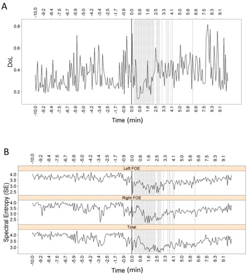 Twenty minutes of temporal dynamic of DoL and SE, 10 min before seizure onset (vertical thick line), and 10 min after seizure onset, for patient G. Vertical dashed lines represent five-second temporal windows with high excitability. (A) DoL constructed upon the whole network recordings (scalp + FOE); (B) Mesial SE. Upper panel corresponds to left FOE, middle panel corresponds to right FOE and bottom panel corresponds to total (both FOE).