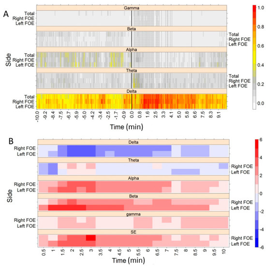 (A) Twenty minutes of temporal dynamics of the RP for each frequency band of patient G. In each panel, RP of Delta, Theta, Alpha, Beta, and Gamma for the left FOE, right FOE and total (Both FOE) are displayed. Warm colors mean higher percentages of spectral power. A thick vertical line represents seizure onset. Vertical dashed lines represent five-second temporal windows with high excitability; (B) Changes in RP and SE (bottom panel), in left and right FOE, quantified by the SMD index, comparing values in a preictal 30-second temporal window with the values taken in several postictal 30-second windows. Reddish hues imply a decrease and bluish hues imply an increase of values with respect to the preictal stage.