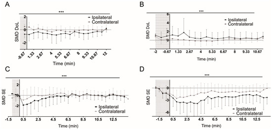 We now turn into the analysis of the entire patient sample. To focus on the postictal period, the origin of times will be set at the moment of seizures termination. The exact moment of the seizure termination was independently informed by an expert neurophysiologist, by using a combination of clinical and EEG signs. In each case, moreover, the average over all seizures—ictal extent was represented as a shaded area. This interval lasts 55.3 ± 21.3 s for PS seizures and 126.4 ± 59.4 s for CP seizures. Firstly, we looked at potential differences between contralateral and ipsilateral sides of PS and CP seizures. The assessment of changes in the DoL through the use of SMD is depicted in Figure 4A for PS and Figure 4B for CP seizures. The statistical analysis revealed significant differences for PS and CP seizures (Z-score = −3.783, p < 0.001 and Z-score = −3.808, p < 0.001, respectively). The decrease in the DoL on the ipsilateral side of PS was found in 91% of the patients. The SMD of the SE shown in Figure 4C,D presented significant differences between contralateral and ipsilateral sides of PS and CP seizures (Z-score = −3.508, p < 0.001 and Z-score = −4.976, p < 0.001, respectively). A decrease in SE was present in the 66% and 94% readings of the ipsilateral sides of PS and CP, respectively.