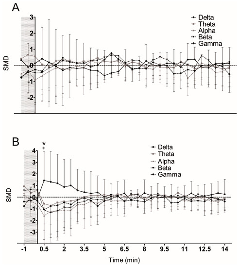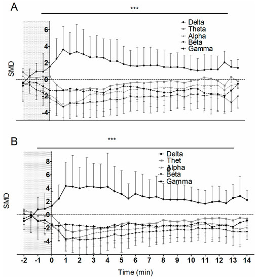 With the aim to use a common metric to evaluate changes in different types of measures—DoL, spectral power, and SE—the standardized mean difference (SMD) was calculated.