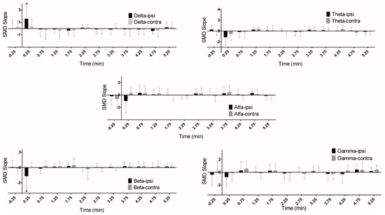 Temporal dynamics of the slope of the SMD of the RP of each frequency band for all the PS seizures. Slope of SMD of the relative spectral power for the frequency bands (Delta, Theta, Alpha, Beta, and Gamma) of ipsilateral and contralateral sides. All graphs represent the ictal period and 5 min after seizure onset. The mean and S.D. are shown. * p < 0.05 vs. contralateral side.