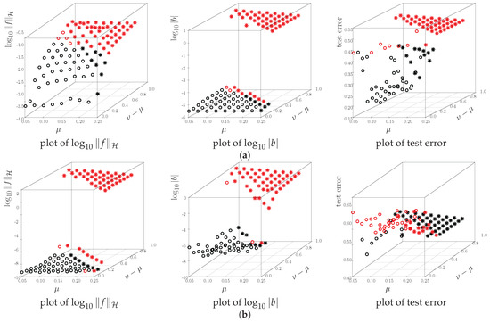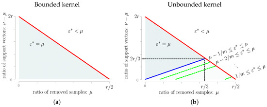 - Unbounded kernel: For , the breakdown point of is less than μ. For , the breakdown point of is equal to μ. When , the breakdown point of is equal to μ, and the breakdown point of is bounded from below by and from above by μ, where depends on ν and μ, as shown in Theorem 3.