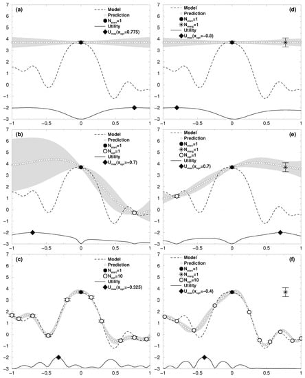 This is plotted in Figure 1a with . The y-value is taken from the sinusoidal model shown (a cos-function with decreasing amplitude), however subjected to whitening, which results in this simple case of one point to the assignment of a zero value. The back-transformation to the scale of the input target value leads to the horizontal line titled “Prediction” (marked by small white circles). As can be seen from Equation (24), the variance increases with the distance from the data point. The utility according to Equation (15) was scaled and normalized to fit within the range of each graph. It produces the result of for the next best point to measure at. Without marginalization, this would be the input datum returning the results of Figure 1b for our simple one-dimensional model. After ten iterations, the prediction is—within the gray uncertainty region—almost pinned down to the model generating function (see Figure 1c).