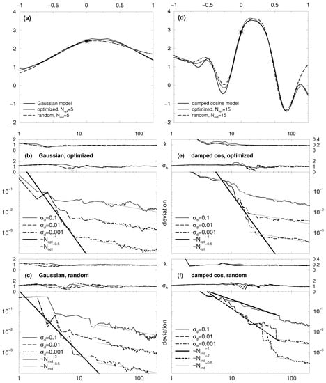 The four Figure 3b,c,e,f show the convergence behaviour of the deviation Equation (27). Since the hyper-parameters λ, , and determine the outcome of the Gaussian process method (see Section 3) and vary a lot in the starting phase of the data acquisition, one has to wait until they have settled. They are plotted in the top of each graph. We restrain from showing , because it hardly varies for the test cases used. One finds that the hyper-parameters stabilize at about 30 data values added for the damped cosine model, and about 20 for the broad Gaussian. From thereon, the decay of the deviation with the increasing data pool clearly shows square root behavior, while up to this settlement, higher power laws are in charge. The actual values of these higher powers for the decay seem to be somewhat arbitrary, but they are still substantial over all test cases to claim that the optimized approach for finding the best next parameter settings is much more fruitful than to set it up randomly.