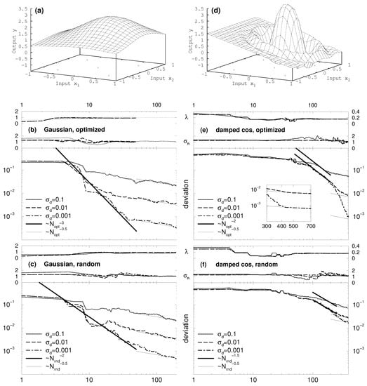 Two test cases for one-dimensional input vectors, = 81. (a–c) Gaussian model; (d–f) damped cosine model. Top row (a,d): model (solid line), initial input data value (filled circle), optimized approach (dotted line) vs. randomly chosen parameter settings (dashed line). Panels (b,c,e,f) with number of added points to the right: in the top of each figure, hyper-parameters λ and ; in the bottom, total difference between target and model for = 0.1 (dotted line), = 0.01 (dashed line), = 0.001 (dot-dashed line). Middle row (b,e): optimized approach. Bottom row (c,f): random parameter setting. The solid lines represent dedicated decay powers.