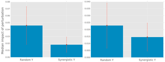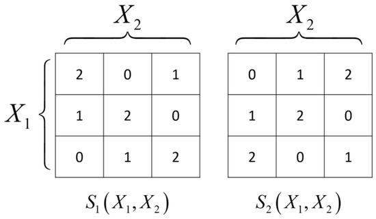 The positive difference must arise from one of the non-negative terms in square brackets in all derivations above. Suppose that and therefore has zero information with any individual OSRV by definition. That is, does not correlate with any possible synergistic relation (SRV) about . In our view, should thus be said to store zero synergistic information about . However, even though by construction, this does not necessarily imply , among others, and therefore any term in square brackets above can still be positive. In other words, it is possible for to “cooperate” or have synergy with one or more OSRVs to have non-zero mutual information about another OSRV. A concrete example of this is given in Section 4.3. This would lead to a non-zero synergistic information if quantified by , which is undesirable in our view. In contrast, our proposed definition for in Equation (5) purposely ignores this “synergy-of-synergies” and in fact will always yield in case , which is desirable in our view and proved in Section 3.5.