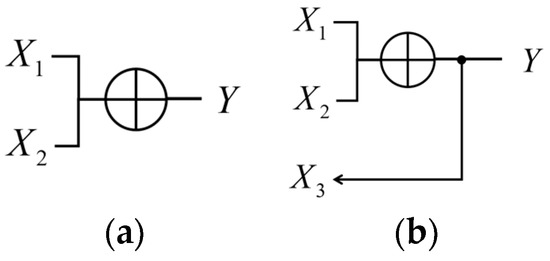 Two independent input bits and as output the XOR-gate. (a) The relation . In (b) an additional input bit is added which copies the XOR output, adding individual (unique) information .