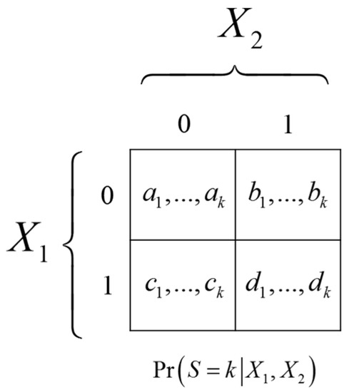 The conditional probabilities of an SRV conditioned on two independent binary inputs. Here e.g., and ai denotes the probability that S equals to state i in casein case .