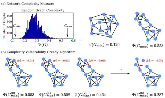 (a) To illustrate our method, we generated 10,000 random Erdős-Rényi networks, all with 12 nodes of four degrees. The distribution of our complexity measure is shown, along with the networks having the lowest and highest values; (b) of an edge is the amount by which is reduced if that edge is removed. We progressively delete the edges with the highest at each step. In this example, most of the complexity in the graph is contained within the upper pentagram-shaped connection structure; the elimination ordering reveals these “complexity-causing” structures.