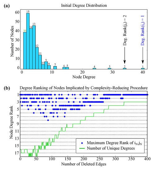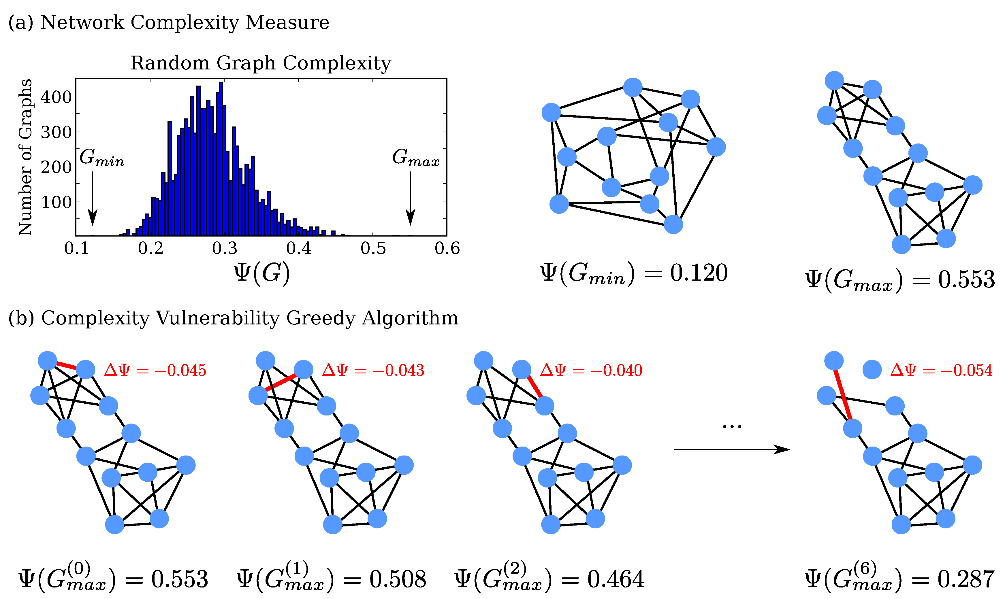 Our greedy algorithm for complexity vulnerability analysis consists of iteratively deleting the graph edges whose deletions cause the largest reduction in graph complexity. That is, for an initial adjacency matrix , we consider all one-edge deletions and recalculate the resulting Ψ, finding the edge which causes the largest reduction in Ψ when deleted. We refer to the new adjacency matrix, with the single edge deletion, as . We then repeat this process with to identify . This is repeated until all N edges are deleted, yielding an edge deletion order .