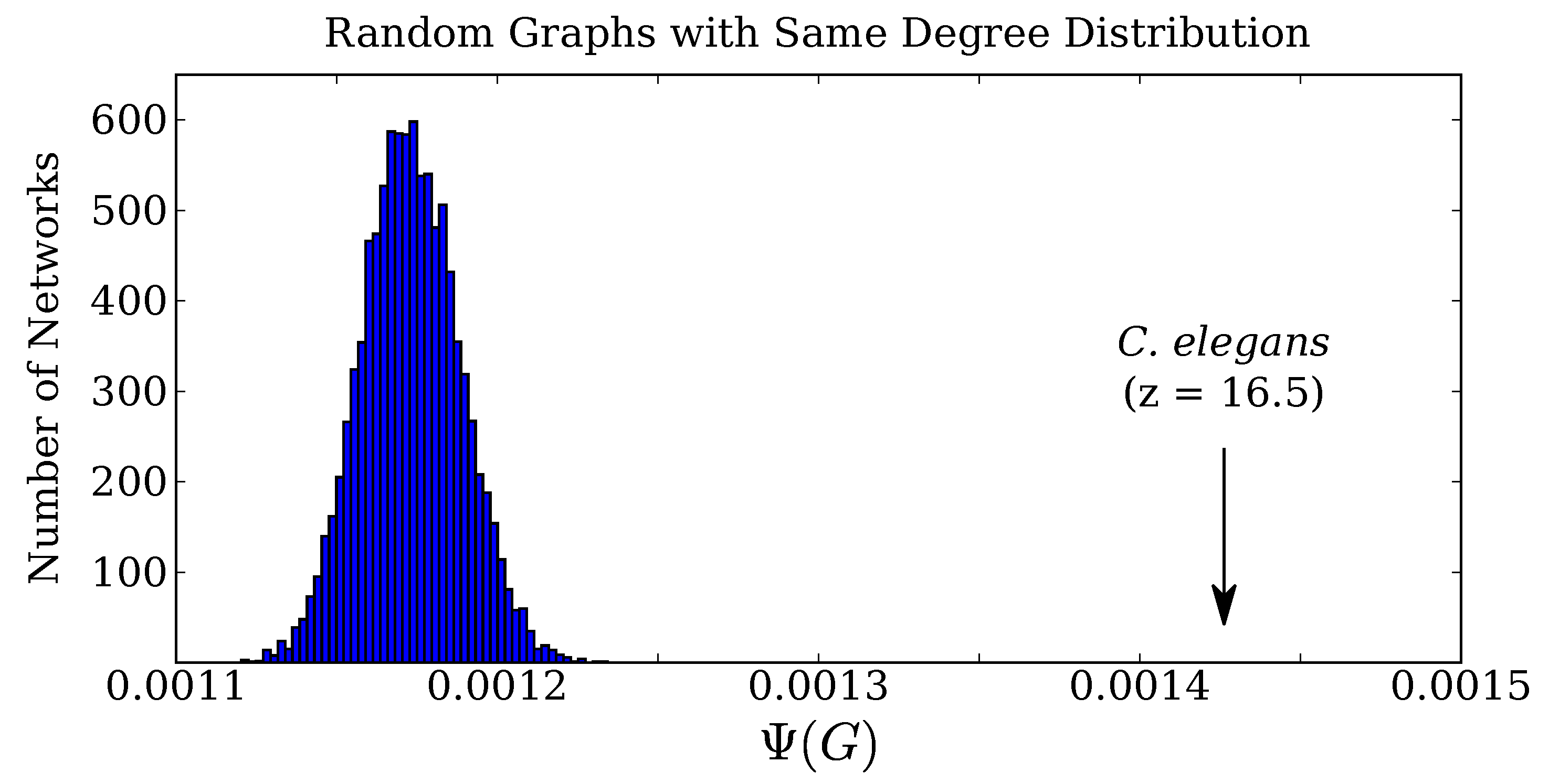 Calculating Ψ for this network reveals that, by this measure, the C. elegans gap junction network is extraordinarily complex. We compare the actual gap junction network’s complexity to the complexity of 10,000 randomly-rewired networks, all of which have the exact same degree distribution (see Methods Section 4.5 for more information). Given its degree distribution, a random graph would have a complexity within an approximately normal distribution with a mean and standard deviation of . The neuron graph, however, has a complexity of , about 16.5 standard deviations above the random graph average. This distribution is plotted in comparison with the actual value in Figure 2.