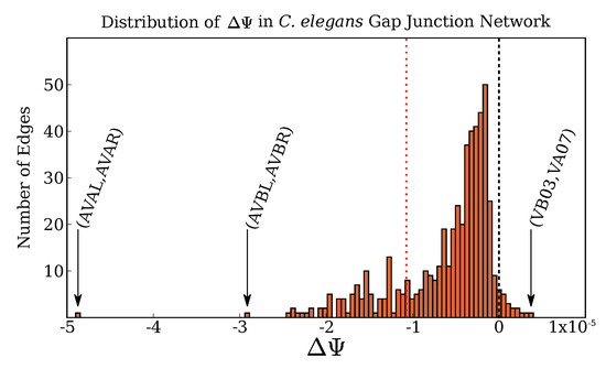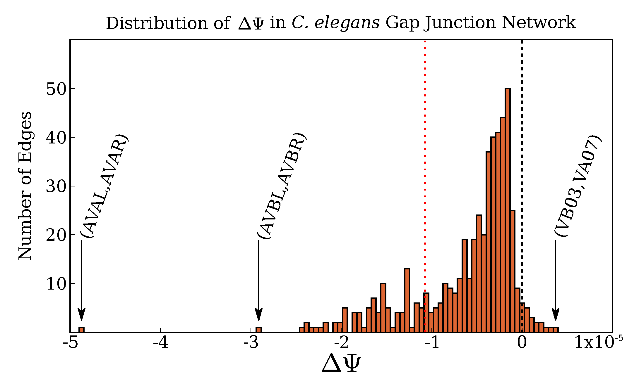 Which edges are most responsible for this unusually high complexity? We use our edge deletion approach to explore this question. We begin by calculating for every edge (i.e., the amount by which the network complexity would change were that edge deleted). The distribution of values is shown in Figure 3. A few outliers are immediately apparent: the link between the command interneuron pair AVAL/AVAR, and the link between another command interneuron pair AVBL/AVBR. This suggests that the important biophysiological role of these neurons may be reflected in the relative complexity of their connection schemes. It is interesting that all edges to the left of the red dotted line implicate at least one interneuron.