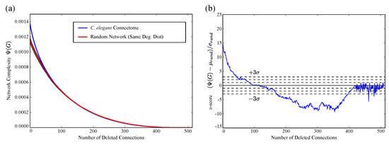 (a) We iteratively delete connections with the highest , causing the complexity to decay as shown by the blue curve. At each point, we calculate for 256 random graphs with the same degree distribution. The red line shows the mean , with the red band showing the range ; (b) the same data converted to z-score (i.e., the number of standard deviations by which the actual network differs from random). The C. elegans gap junction network is initially much more complex than randomly expected, but as we successively delete edges, it reveals an underlying network that is much less complex than random.