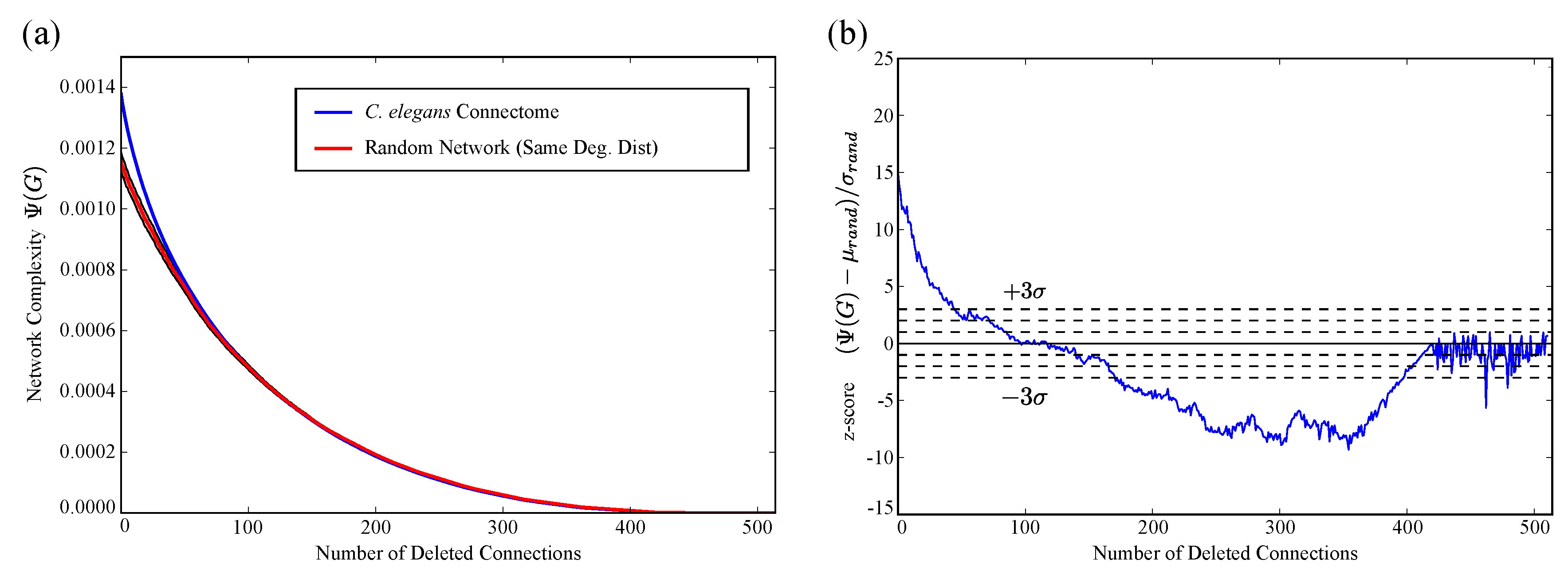 In spite of these current limitations, this study strongly suggests that quantifying a network’s global complexity, performing vulnerability analysis using this complexity measure, and then iteratively eliminating edges based upon their vulnerability at each step is a useful direction for identifying physiologically important structures within complex graphs. Such methods are increasingly important as increasingly large and difficult-to-comprehend neuronal networks are measured by the burgeoning field of connectomics [34,35,36]. In a real network, the interaction between the structural features, the behavior and flexibility of the network function, the vulnerability to damage and the costs of wiring the networks are fundamental. The trade-offs can only be fully understood by careful quantitative analysis of the kind begun here. Given the potentially scale-invariant nature of neuroscience networks [24], the architectural principles we infer from these complex networks may yield broader design insights into the function and structure of nervous system networks.