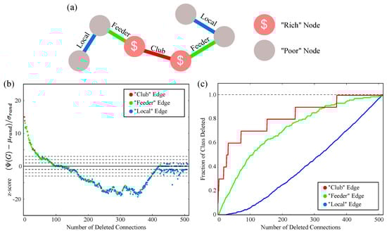 The C. elegans synaptic network was shown by Towlson et al. [24] to possess a rich club structure. We consider the set of neurons which they identified as the “rich club” due to their associated biological significance, though it should be noted that the gap junction network does not itself have the same rich club structure. Using the terminology of Towlson et al. [24], each edge in the graph can be classified as a “club” edge (if it connects two rich nodes), a “feeder” edge (if it connects a rich, high degree node to a poor node), or a “local” edge (if it connects two poor nodes). This is illustrated in Figure 5a. In Figure 5b, we label each edge in our deletion order according to these classes. This shows that the iterative procedure disproportionately targets club and feeder edges: out of the first 100 edge deletions, 19% are local, 74% are feeder, and 7% are club. By comparison, the intact network edges are about 69% local, 29% feeder, and 2% club. A -test shows that the probability of randomly drawing as many feeder and club edges out of the network is less than ; thus, the edge selection process heavily targets the rich club. This disproportionate targeting can be seen by looking at the percentage of each class that has been deleted at each iteration, as shown in Figure 5c.