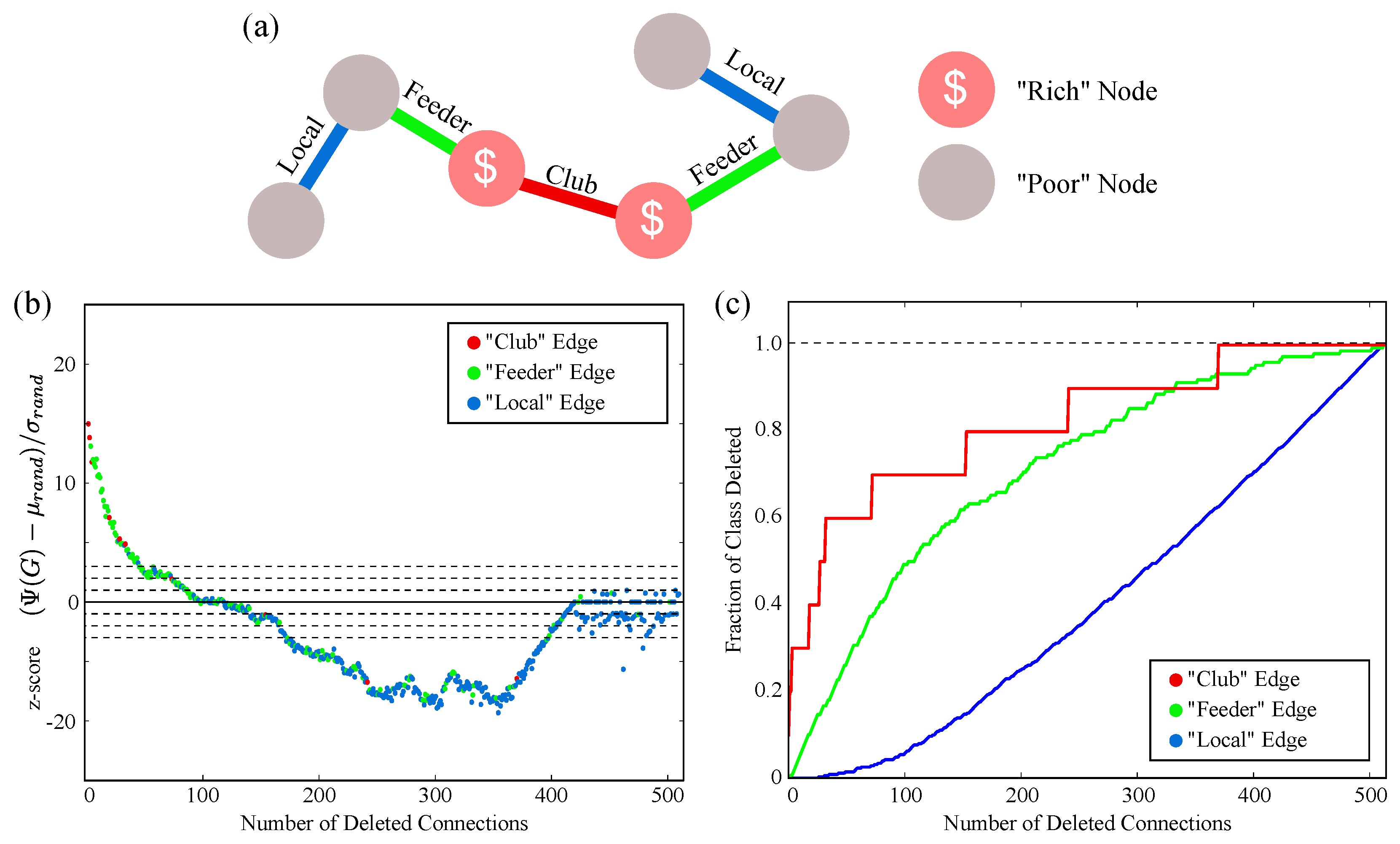 (a) As in [24], the C. elegans synaptic Connectome can be understood to have a “rich club” structure. Edges are classified as “Club” (if between two rich nodes), “Feeder” (if between a rich and poor node), or “Local” (if between two poor nodes); (b) the same curve as Figure 4b, with each deleted edge labeled by class. In the region where the graph is much more complex than average, the procedure disproportionately targets Club and Feeder edges; (c) the fraction of each class which has been deleted at each iteration.