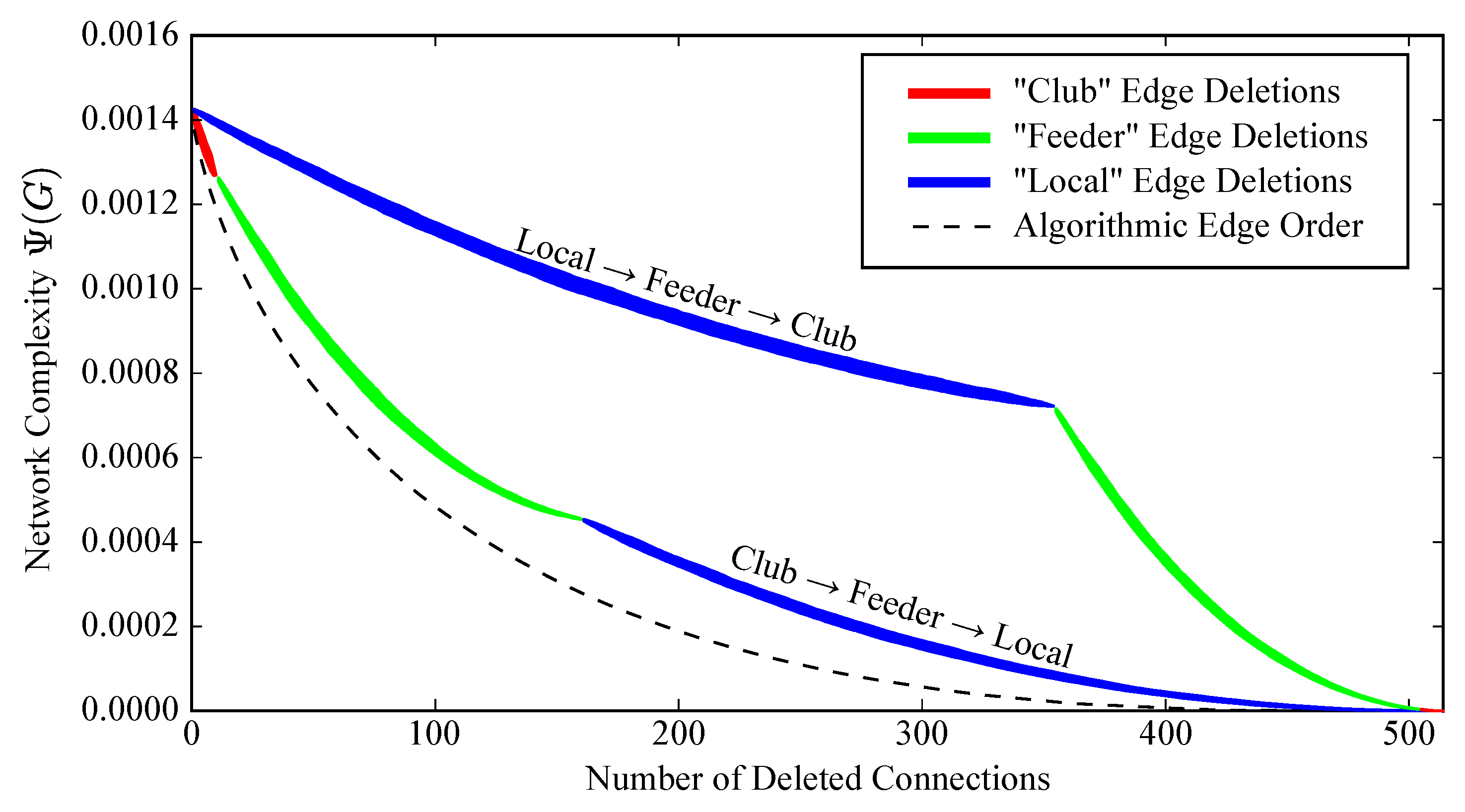 In 50 trials, we deleted all club edges in a random order, then all feeder edges, and then all local edges. The red/green/blue bands show the average resulting complexity curve within one standard deviation. This was repeated for 50 trials in which we instead deleted local edges, then feeder edges, and then club edges. The resulting distribution of complexity curves is indicated by the blue/green/red bands. The edge deletion order prescribed by our algorithm (i.e., the blue curve in Figure 4a) is shown by the black dotted line. A random Club/Feeder/Local deletion order results in a significantly slower complexity decay than our algorithm prescribes, but leads to a much larger decrease in complexity than the Local/Feeder/Club ordering. Thus, the results implicating the rich club are robust to the specific edge deletion order.