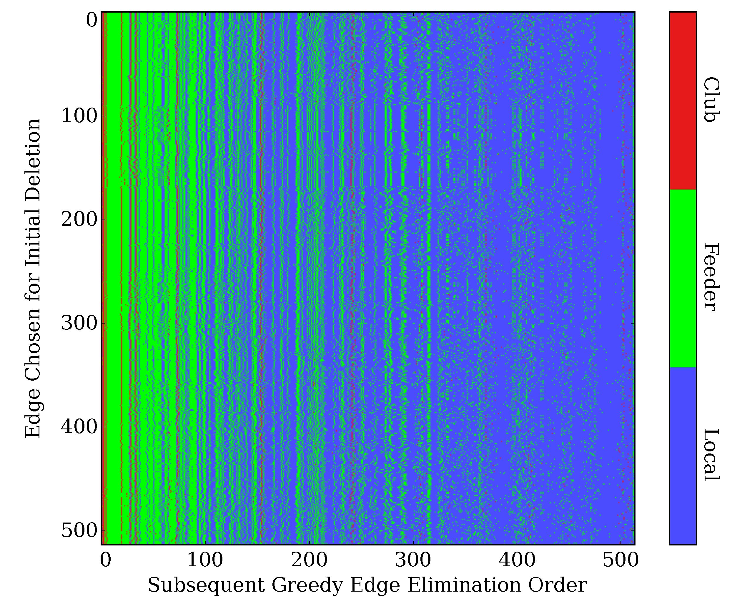 We directly investigated this possibility by repeating the analysis of Figure 5, but with an arbitrary edge chosen at the first deletion step (followed by the greedy iterative deletion procedure). This was repeated for all possible choices of initial edge deletions (i.e., for all 514 edges). When AVAL/AVAR is chosen initially (as in the full greedy procedure), the results are, of course, identical to the previous results. For all of the other 513 initializations, however, the greedy procedure chooses AVAL/AVAR as the very next edge to be deleted. Furthermore, the procedure continues to target club/feeder edges in largely the same manner. Figure 8 shows the order in which edges of each class are deleted for all possible initial edge choices. Despite minor variations in edge ordering, the order in which edges are targeted by the greedy procedure appears to be largely robust to the initial edge choice, and the disproportionate targeting of club/feeder edges does not depend upon this initialization.