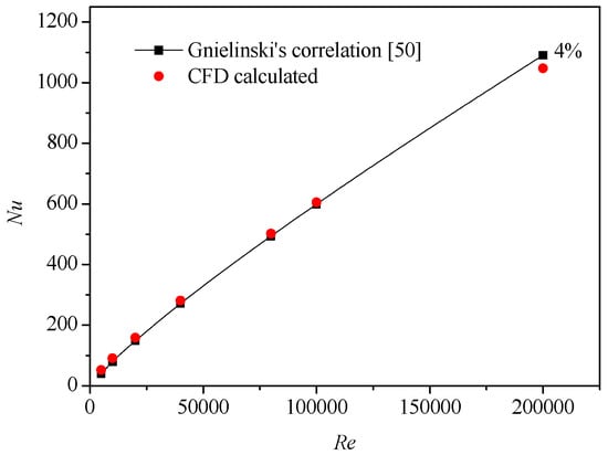 Validation of CFD calculated Nusselt number with Gnielinski’s correlation [50].