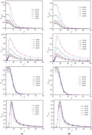 Figure 5 shows the dimensionless local entropy generation by direct dissipation, turbulent dissipation, mean temperature gradients and fluctuating temperature gradients at different Reynolds number, in which the fluids with nanoparticle concentration of 0%, 1%, 2%, 4% and 6% are taken into account. From these figures, the peak value of the four terms can be found in the flow domain. However, the peak value of entropy generation from mean gradients, i.e., and , exist in the viscous sublayer (y+ < 5) due to steep gradients here ( and ), while the peak value of entropy generation from fluctuation, i.e., and , lie in the buffer layer, inner edge of buffer layer accurately (y+ ~ 10) because of violent turbulence here. In a detailed view, the entropy generation by direct dissipation decreases monotonously when y+ increases, but the term owing to the turbulence dissipation grows rapidly form 0 to its peak value in the sublayer to inner edge of buffer layer, and then reduced gradually when y+ increases unceasingly. Similar results are found in the distribution of entropy generation by mean and fluctuating temperature gradients, but some difference exists in the near wall region. The entropy generation due to mean temperature gradients hardly changes or with some small rise in the sublayer to inner edge of buffer layer, and the value of water is greater than that of other nanofluids, while no discrepancy for the value of entropy generation by fluctuating temperature gradients existed in the sublayer when the concentration of nanoparticle increases.