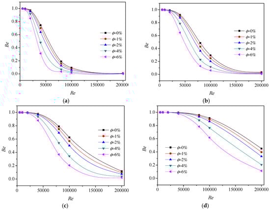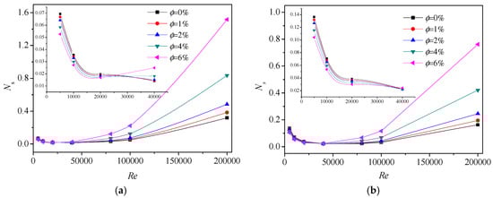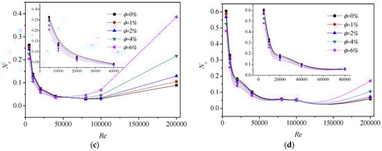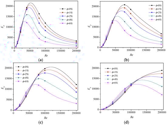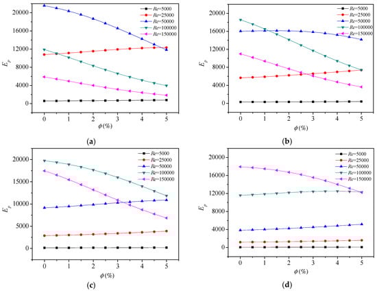 Figure 9 shows the variation of Ep with particle concentration at some fixed Reynolds number. From these figures, it can be observed that the performance is improved at low or medium Re, while deteriorated at high Re as nanofluids is denser and denser when the heat flux is 50,000 W/m2, as shown in Figure 9a. Moreover, the performance of Re = 50,000 is the best among the five Reynolds conditions on most occasions, and the performance of Re = 150,000 is just slightly better than that of Re = 5000. The possible reason can be concluded as that the flow of Re = 150,000 causes much more entropy generation by turbulent dissipation. Intersection points are found in the figure as well, that is the intersection of the Ep curve of Re = 25,000 and the Ep curve of Re = 50,000 at , and the intersection of the Ep curve of Re = 25,000 and the Ep curve of Re = 100,000 at , which mean that performances are same here. Before the intersection, the performance of higher Re is better than that of lower Re, but this becomes opposite after the intersection, i.e., the performance of lower Re is better than that of higher Re. The same phenomena can be found in the remained photos of Figure 9. Therefore, the work here provides the advisable particle concentration range to the enhanced heat transfer processes for the given Reynolds number.