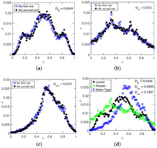 Figure 1d that the histograms obtained from the one-dimensional component of different systems are quite diverse. Although the difference can be perceived by human eyes, it can be better detected statistically. In the present work, the well-known Kullback–Leibler divergence (KLD) [