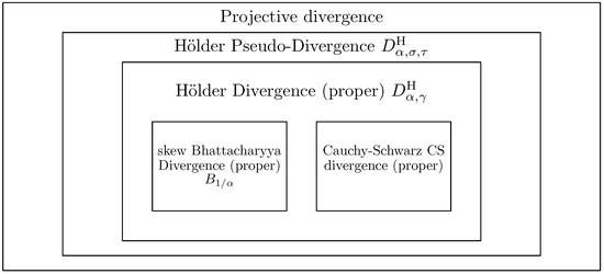 - In manifold learning [44,45,46,47], it is an essential topic to align two category distributions and corresponding respectively to the input and output [47], both for learning and for performance evaluation. In this case, the dimensionality of the statistical manifold that encompasses and is so high that to preserve monotonically in the resulting is already a difficult non-linear optimization and could be sufficient for the application, while preserving perfectly the input is not so meaningful because of the input noise. It is then much easier to define pseudo-divergences using inequalities which do not necessarily need to be proper with potentially more choices. On the other hand, projective divergences including Hölder divergences introduced in this work are more meaningful in manifold learning than KL divergence (which is widely used) because they give scale invariance of the probability densities, meaning that one can define positive similarities then directly align these similarities, which is guaranteed to be equivalent to aligning the corresponding distributions. This could potentially give unified perspectives in between the two approaches of similarity-based manifold learning [46] and the probabilistic approach [44].