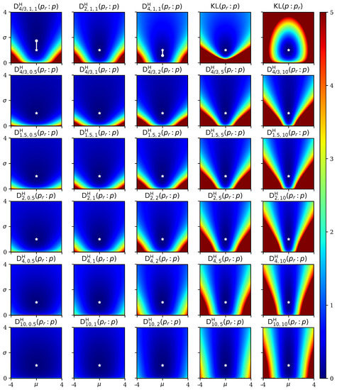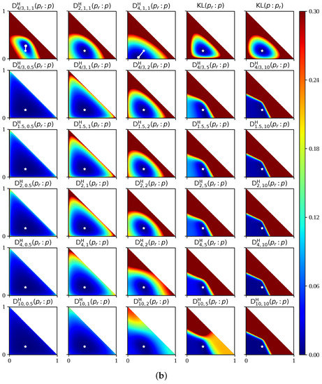 - In an estimation scenario, we can usually pre-compute according to . Then, the estimation will automatically target at . We call this technique “pre-aim.”For example, given positive measure , we first find to satisfy . We have that satisfies this condition. Then, a proper divergence between and can be obtained by aiming towards . For conjugate exponents α and β,This means that the pre-aim technique of HPD is equivalent to HD when we set .As an alternative implementation of pre-aim, since , a proper divergence between and can be constructed by measuring:turning out again to belong to the class of HD.In practice, HD as a bi-parametric family may be less used than HPD with pre-aim because of the difficulty in choosing the parameter γ and because that HD has a slightly more complicated expression. The family of HD connecting CS divergence with skew Bhattacharyya divergence [8] is nevertheless of theoretical importance.