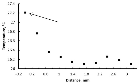 The first series of experiments was performed with the hollow top depicted in Figure 1A. The mass of the top was varied from 8.650 to 99.330 g by filling its conical cavity with steel balls, as shown in Figure 1B. The mass and diameter of the balls were m = 0.465 ± 0.0005 g and D = 4.8 ± 0.05 mm. The angular velocities of spinning of the full (i.e., filled with steel balls) and hollow tops were and , respectively. Thermal imaging of the rotation of the top was carried out with the Therm-App TAS19AQ-1000-HZ thermal camera (manufactured by Opgal Optronic Industries, Karmiel, Israel) equipped with a LWIR (long-wave-length infrared) 6.8 mm f/1.4 lens. A typical image, representing the temperature field observed under the rotation of the heavy top, is supplied in Figure 2. A distinct thermal track from the heavy spinning top’s tip neb is present on the surface, whereas in the case of a light top the track is beyond the measurement sensitivity range. The thermal field arising from the spinning of the top is supplied in Figure 3. The maximal temperature jump established for the hollow top with a mass of 8.650 g was 0.3 ± 0.07 °C, whereas the top filled by steel balls (m = 99.330 g) gave rise to a temperature jump close to one centigrade, as shown in Figure 3. These results are well expected, due to the fact that the heavier tops led to larger friction forces, resulting in higher heat dissipation. The qualitative observation should be emphasized: when the hollow light top started its rotation on a rough paper when inclined from vertical to θ = 26° ± 0.5° (θ is one of the three Euler angles, see Reference [13]), it continued the inclined spinning until reaching a complete stop (during 30 s), whereas the heavy top, inclined at θ = 26° ± 0.5°, was re-oriented vertically after ca. 8 s of rotation. It was observed that the orientation time decreases with the surface roughness increase. It took 14 s to align the heavy top from θ = 26° ± 0.5° to the vertical orientation on a polished marble plate, and almost 20 s on a glass slide.