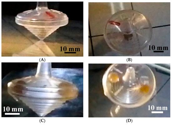 Orientation of quasi-steadily rotating transparent tops, filled by steel balls. (A) Top containing a pair of two steel balls; (B) Top containing a triad of steel balls; (C,D) Rotating top containing two pairs of steel balls.