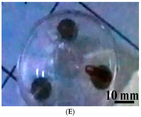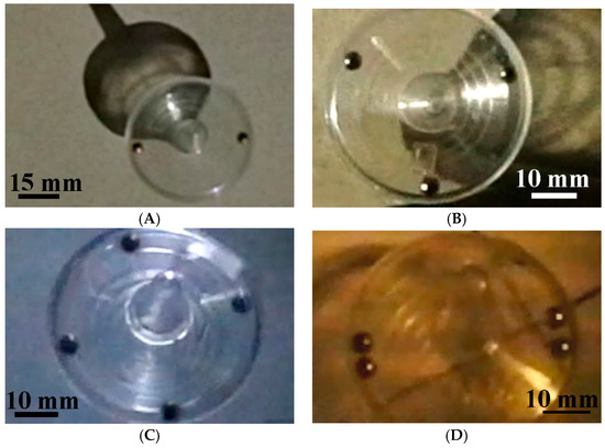The second series of experiments was performed with the hollow transparent top depicted in Figure 1A, filled by a number of agate (m = 1.340 g, D = 9.7 ± 0.05 mm) and steel balls. The number of balls was varied from one to four, as depicted in Figure 4 and Figure 5. The angular velocities of the tops at quasi-steady spinning time-spans were for agate balls and for steel ones. The use of the transparent top allowed direct visualization of the location of the steel and agate balls within the top. It was observed that spinning ball-filled tops always adopted a symmetric configuration of balls, where the axis of symmetry was the free axis rotation of the system comprised of the top and balls. When a top was filled by a single agate ball, it chose the lowest possible position at the free axis of the top, as depicted in Figure 4A,B. A pair and triad of agate balls were located symmetrically relative to the axis of rotation at the equator of the top, as shown in Figure 4C,D. Similar results were obtained with the top filled by steel balls, as illustrated in Figure 5. It should be emphasized that when the top was filled by four steel balls, two symmetrical configurations were possible, as depicted in Figure 5C,D; both of them were experimentally observed. One more experimental observation is noteworthy, namely that when the hollow top was greased from inside by silicone oil (polydimethilsiloxane, Mn = 17,000, supplied by Aldrich), the spatial orientation of the agate and steel balls within the cavity of the spinner remained the same. This means that viscous friction also promotes symmetrization of the rotating system.