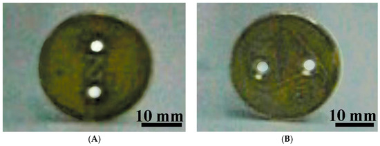 Orientation of the rotating coin containing a pair of holes. (A) Orientation of holes corresponding to the maximal momentum of inertia of the coin; (B) Orientation of holes corresponding to the minimal momentum of inertia of the coin, relative to the vertical axis.