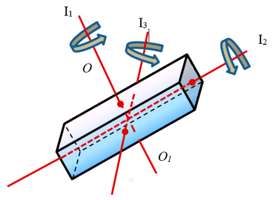 The mechanism of orientation of spinners by friction is discussed in detail in the classical course by Levi Civita and Amaldi (see Reference [17]). Friction force dictates the orientation of the axis of rotation for a variety of tops, and thus decreases the number of rotational degrees of freedom in the system [15,16,17]. A rectangular parallelepiped falling through air, depicted in Figure 7, supplies another illustrative example of the orientation of a rotator by air friction forces. Owing to the viscous friction, the body chooses to rotate around the main axis OO1, corresponding to the maximal moment of inertia [18]. This orientation effect leads to the generation of negentropy in a system of rotators.
