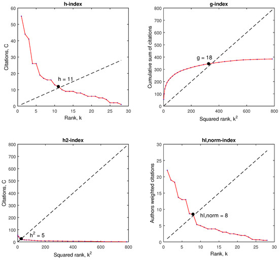 The h-index was proposed in 2005 by the physicist Jorge E. Hirsch to measure the scientific output of individual researchers [2,3]. A researcher has index if h is the largest number such that his h most cited publications have at least h citations each. For determining h, we can adopt a simple procedure. Firstly, we sort the number of citations per publication by decreasing order for obtaining the citation profile , where represents the rank, and, afterwards, for the array we have . In practice, h is close to the intersection of and . The h-index has a time memory since it captures the accumulation of citations.