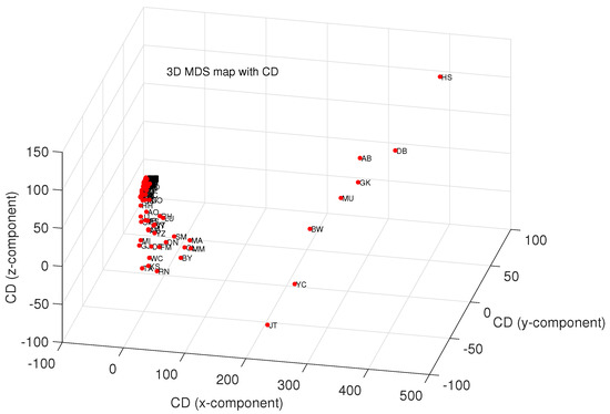 Figure 3, Figure 4 and Figure 5 depict the three-dimensional maps generated by the MDS with , and (). The value of was chosen to obtain good discrimination between items [51]. For all cases, we observe that the points representing researchers form similar patterns, namely, those on the right-hand side of the charts. Nevertheless, any other possible patterns (in case they exist) are hidden by the large number of points.