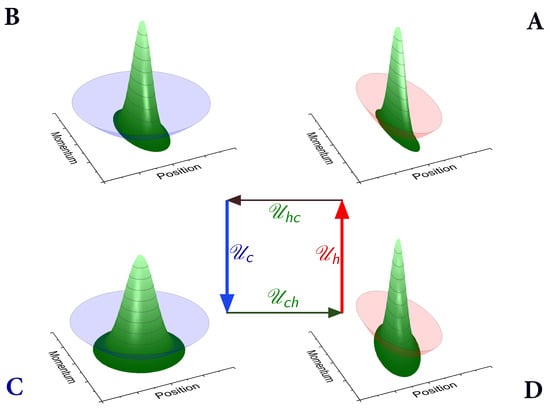 The cycle propagator is a completely positive (CP) map of the state of the working medium [34]. The order of propagators is essential, since the segment propagators do not commute; for example, . The non-commuting property of the segment propagators is not an exclusive quantum property. It is also present in stochastic descriptions of the engine where the propagators operate on a vector of populations of the energy eigenvalues. Nevertheless, it can have a quantum origin for engines with propagators with small action [35,36]. The same operators but with different parameters (such as different frequencies) can be used to describe an Otto refrigeration cycle. Figure 1 shows a schematic representation of the Otto cycle in phase space.