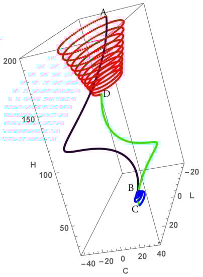 Otto refrigeration cycle displayed in the thermodynamical variables . When the working medium is in contact with a hot bath, the system exhausts heat and equilibrates, spiralling downward from a high (energy) value and towards zero correlation and Lagrangian (i.e., towards thermal equilibrium). The hot ishochore is marked by the red dotted line . On the expansion adiabat, the system spirals downwards, losing energy as it cools down—marked by the green line . It then spirals upwards (blue line), gaining energy from the cold bath . In addition, it spirals towards zero and . Then, the compression adiabat (black line) takes it back to the top of the hot (red) spiral .