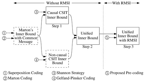 Step 3: Moving on to the channel with RMSI, we propose a pre-coding scheme in order to take RMSI into account. We use our pre-coding scheme in conjunction with the schemes achieving the best inner bounds for the causal and non-causal categories without RMSI, and derive a unified inner bound, which is the best inner bound for all three categories with RMSI. This inner bound reduces to the unified inner bound without RMSI by setting RMSI to zero.