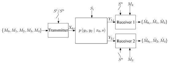 With RMSI, without state: The capacity region of the discrete memoryless channel with complementary RMSI is achieved by multiplexing all of the requested messages into only one codebook [15,16]. This scheme is a special case of our scheme obtained by setting . Note that and are equal to zero in this message setup.