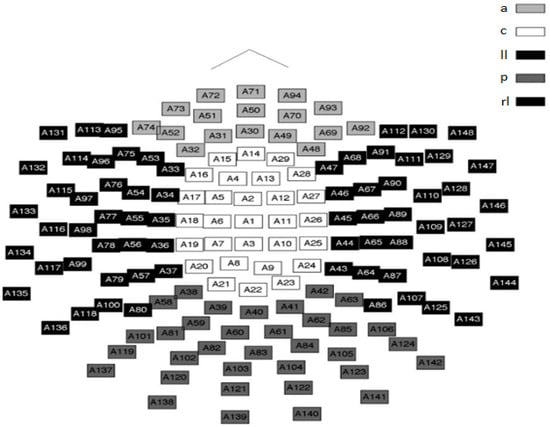 Sensor-space representation of the layout of the location of the 148 SQUID channels in the neuromag used to record MEG signals. The five highlighted regions represent the sensor groupings used to define the different parts of the brain i.e., anterior (a), central (c), left lateral (ll), right lateral (rl) and posterior (p). These regions were also used for the statistical analyses [4].