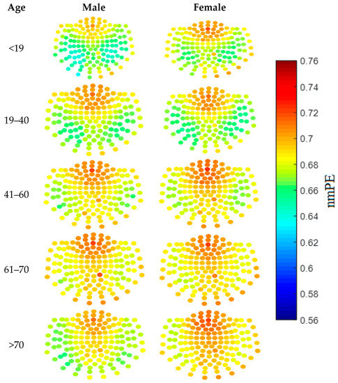 To assist in this selection process, a qualitative approach was taken, where visualisation of the results was done using both nmPE and nPE values. Results from this analysis showed that the ideal values for m ranged between 4 and 6 for nPE (with 5 showing the clearest visual differences), while for nmPE m = 4 and m = 5 yielded the best results. As m = 5 showed the clearest visual differences this value of m was used in the rest of the study. This qualitative stage provided a quick identification of the regions of the brain with higher PE than others. In addition to this, it acted as a visual tool to inspect how the values of each node sensor, and broadly each brain region, changed with age. For instance the sensor nodes with highest PE values for both genders are located over the anterior region of the brain. Moreover, females in group 5 (i.e., >70 years), have sensor nodes with higher nmPE values in the anterior and central regions of the brain when compared to their male counterparts. Though these qualitative analyses may not be used to determine significance, the use of colour maps as a visualisation tool can highlight areas of the brain with potentially interesting information between inter- and intra- gender and age groups.