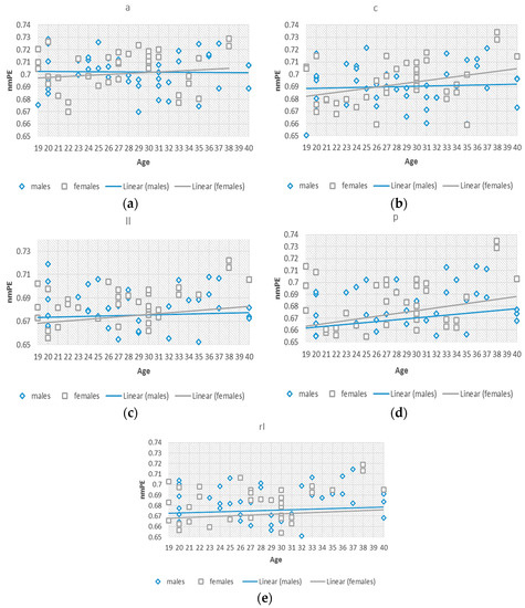 The linear increase of the nmPE values, with age as an independent factor, for both genders is shown here, with males shown in blue and females in grey. The slopes for both models indicated a positive tendency of nmPE values in both gender groups. (a) anterior (a); (b) central (c); (c) left lateral (ll); (d) posterior (p); (e) right lateral (rl).