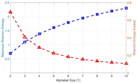 Maximum Shannon entropy (shown by blue square) and entropy excess (shown by red triangle) for different alphabet sizes . The unit for each of Shannon entropy and entropy excess is the natural unit of information (i.e., nat).
