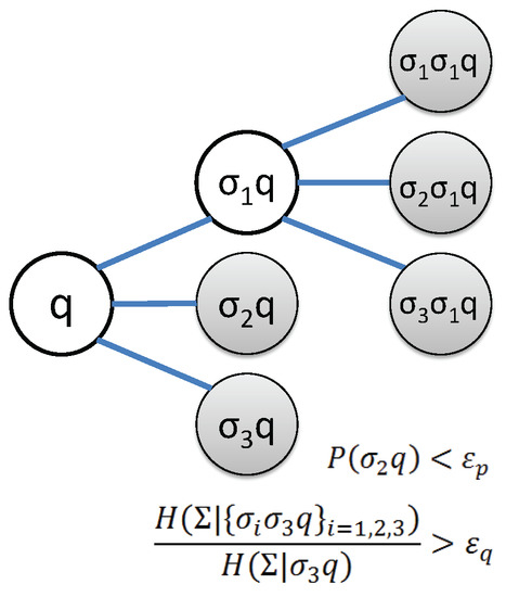 The above structure of PFSA allows a rich library of possible words with a small alphabet. For example, if the alphabet and the maximum length of each word is 3, then one may have a mixture of words from length 1 to 3 such as, , and 111. More elaborate examples are given by Mukherjee and Ray [6].