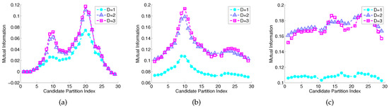 Mutual information for each candidate partitioning locations for each iteration at different depth D of the PFSA model. The unit for mutual information is the natural unit of information (i.e., nat). (a) 1st iteration, & ; (b) 2nd iteration, & ; (c) 3rd iteration, & .