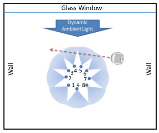 Figure 8 depicts layout of the experimentation. The sensor network is placed at the center of a square room in which only one wall has open windows that are exposed to the sun. All experiments have been conducted during days under partially cloudy conditions, where the sunlight is intermittently blocked by clouds. Due to the orientation of sensors, the effects of the environment are different for those of the individual sensors. Sensors which are facing the windows (i.e., the ambient light source) would have different levels of reading when compared with the rest of the sensors. Changes in the ambient light affect the moving target as the readings of some of the sensors fluctuate more significantly.