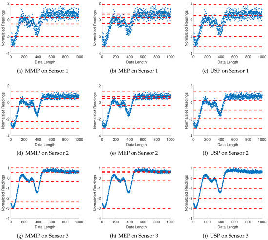 Three different types of partitioning, namely, the proposed maximum mutual information partitioning (MMIP), maximum entropy partitioning (MEP), and uniform space sartitioning (USP) for time series of sensors 1, 2, and 3. Plots (a–c) represent sensor No. 1; plots (d–f) represent sensor No. 2; and plots (g–i) represent sensor No. 3. The alphabet size for each case is , which is obtained by Subtask 1. The partitioning line segments for symbolization are shown by (red) dashed horizontal lines and time series of sensors are marked in (blue) solid-line profiles.
