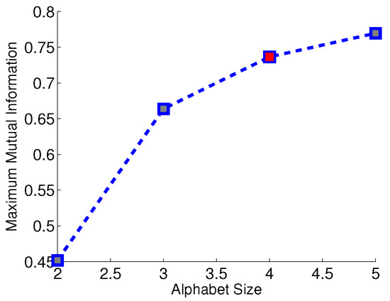 Average maximum mutual information over 9 sensors for different alphabet sizes. is chosen as the selected alphabet size as marked in red. The unit for mutual information is the natural unit of information (i.e., nat).